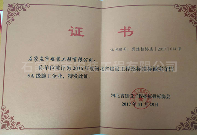 2016年度河北省建設(shè)工程招標(biāo)投標(biāo)誠實(shí)守信5A級(jí)施工企業(yè)